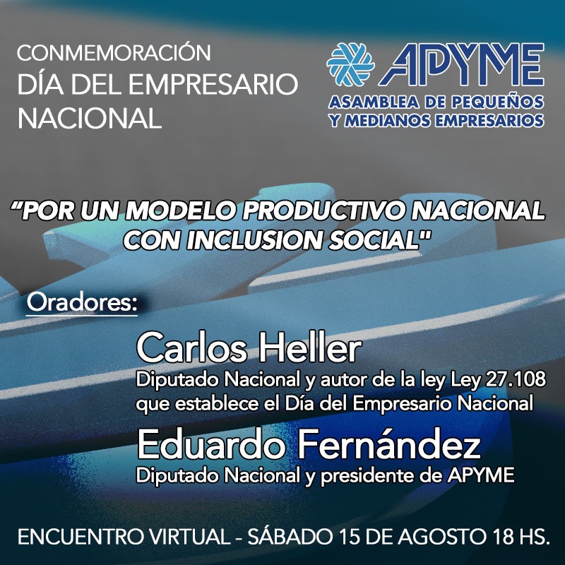 Ante una nueva conmemoración del Día del Empresario Nacional, el próximo sábado 15 de agosto a las 18 hs la Asamblea de Pequeños y Medianos Empresarios (APYME) realizará un encuentro virtual con empresarios Pymes de todo el país, que será encabezado por el diputado nacional y dirigente cooperativista Carlos Heller y el presidente de APYME y también diputado nacional Eduardo Fernández.