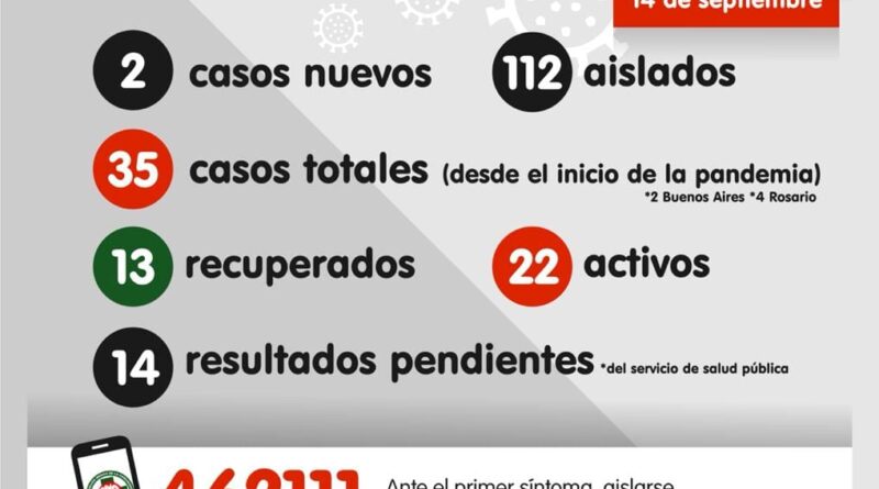 Dos nuevos casos positivos, -uno por contacto estrecho y el otro caso se está tratando de detectar- pone en alerta a la comunidad. También reportamos un nuevo caso ya recuperado. Volvemos a recordar la importancia de ante la aparición de síntomas auto aislarse y comunicarse con su médico de cabecera o al Samco 462111.
