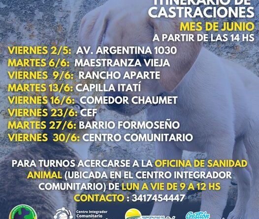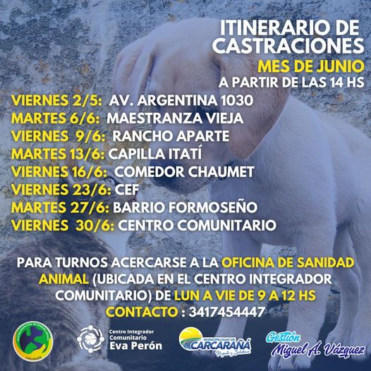 ArgentinaCarcarañáDepartamento San LorenzoNuevo Rumbo CASTRACIONES GRATUITAS con turno previo. 22 junio, 2023 Raquel Vaschetto Itinerario JUNIO Vacunas Antirrábica sin turno previo Les dejamos las ubicaciones y las fechas!