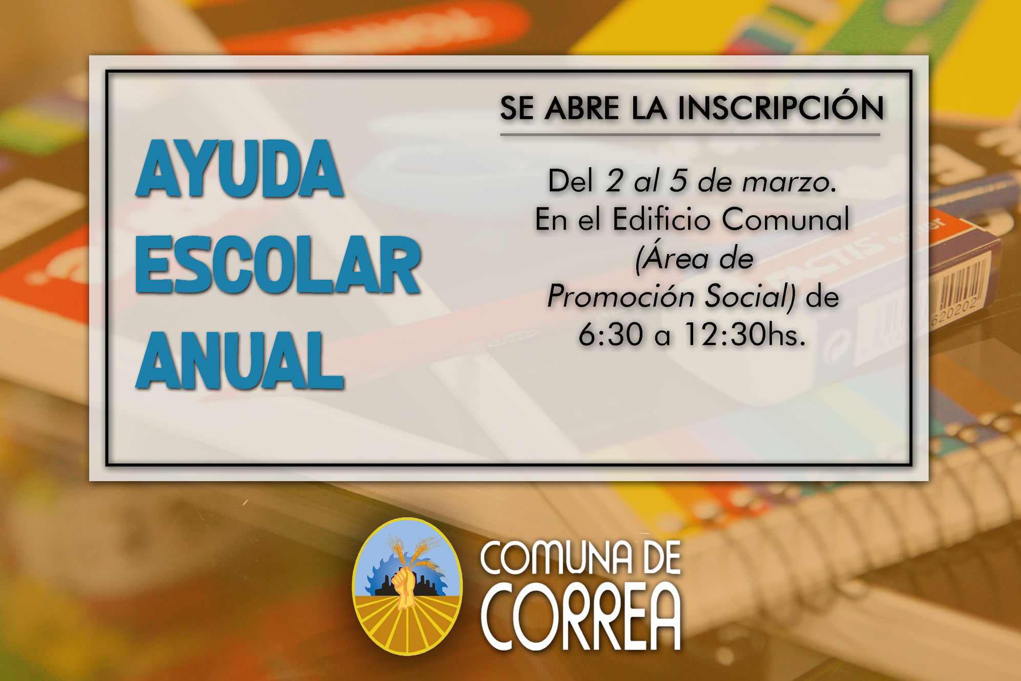 Del 2 al 5 de Marzo en el Edificio Comunal (Área de Promoción Social) de 6:30 a 12 30hs. se abre la inscripción para la entrega de útiles escolares. Se trata de una iniciativa para acompañar la educación de los niño/as del pueblo apoyando a todas las familias.