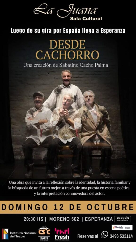 y gira internacional por España. El dramaturgo y actor argentino Sabatino Cacho Palma, vuelve en un rol protagónico de su propia dramaturgia: un montaje poético sostenido en un actor narrador que en primera persona comparte y celebra una historia singular, nuestra historia, en 3 generaciones. -Obra seleccionada para participar del programa ESPACIO SANTAFESINO, programa de estímulos a las industrias culturales del Ministerio de Cultura de Santa Fe-