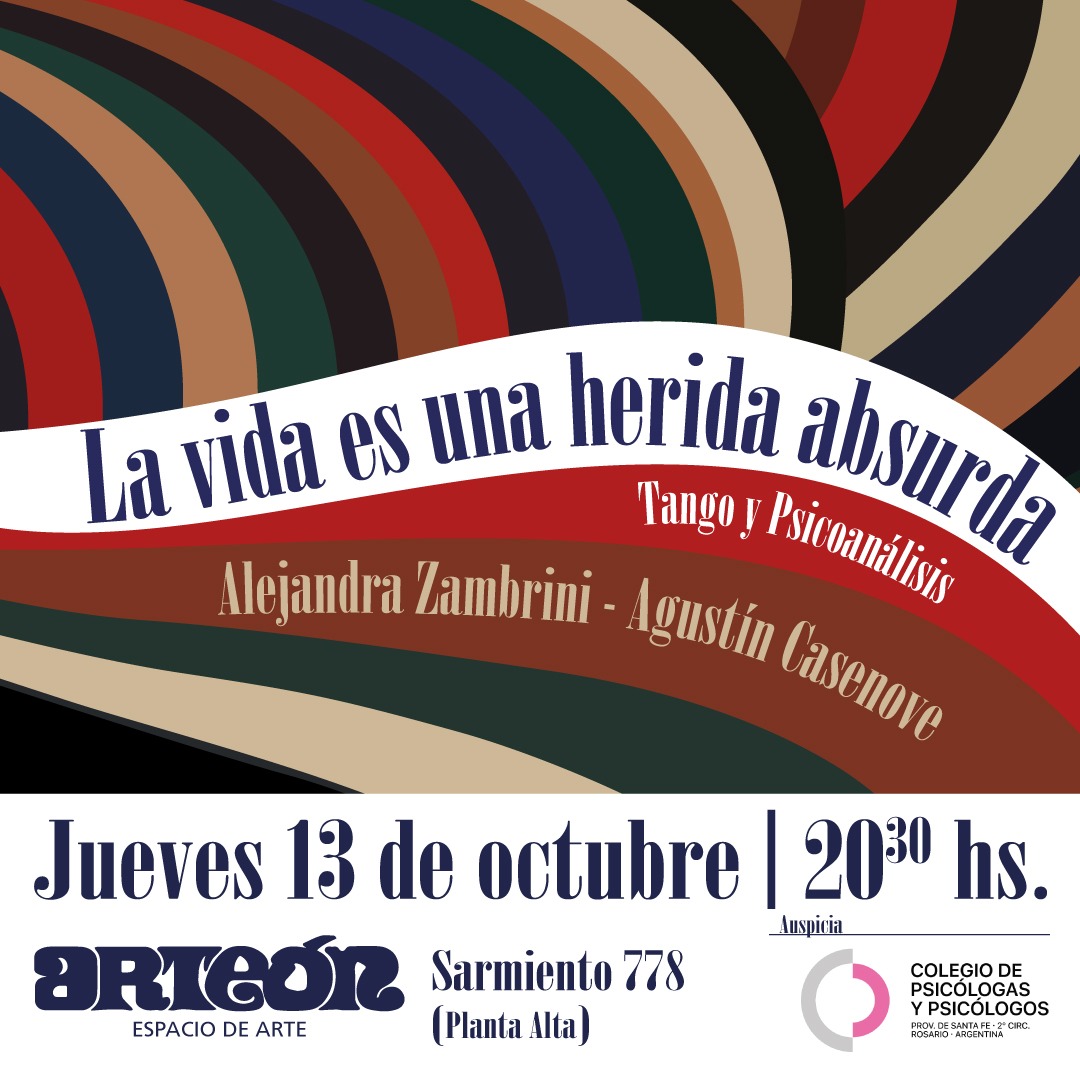 En ocasión del día del/la Psicólogx, Sala Arteón y el Colegio de Psicologxs, invitan el jueves 13 de Octubre a las 20:30 hs. a disfrutar de «La vida es una herida absurda», con Alejandra Zambrini y Agustín Casenove. Al finalizar la puesta en escena, Sabatino Cacho Palma (psicoanalista, teatrista), Fabiana Bertín, (psicoanalista, docente universitaria) Carolina del Fresno (psicóloga) y Humberto Lobbosco (escritor, poeta) nos invitarán a ejercer el arte de dialogar acerca de la obra y sus marcas en cada cual.