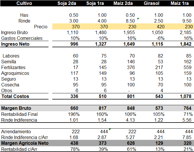 márgenes brutos generales de todos los cultivos de gruesa que se producirán en la
