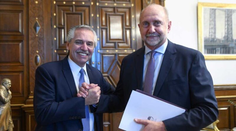 El presidente de la Nación, Alberto Fernández se comprometió «revisar» el accionar de la Nación en territorio santafesino para intentar frenar el avance violento del narcotráfico. Prometió, también, acelerar la instalación en Rosario de una sede la Unidad de Información Financiera (UIF), y enviar al Congreso en extraordinarias los proyectos para fortalecer la estructura de la justicia federal en la provincia. FOTO: El 1er. mandatario del país y el gobernador santafesino Omar Perotti.-