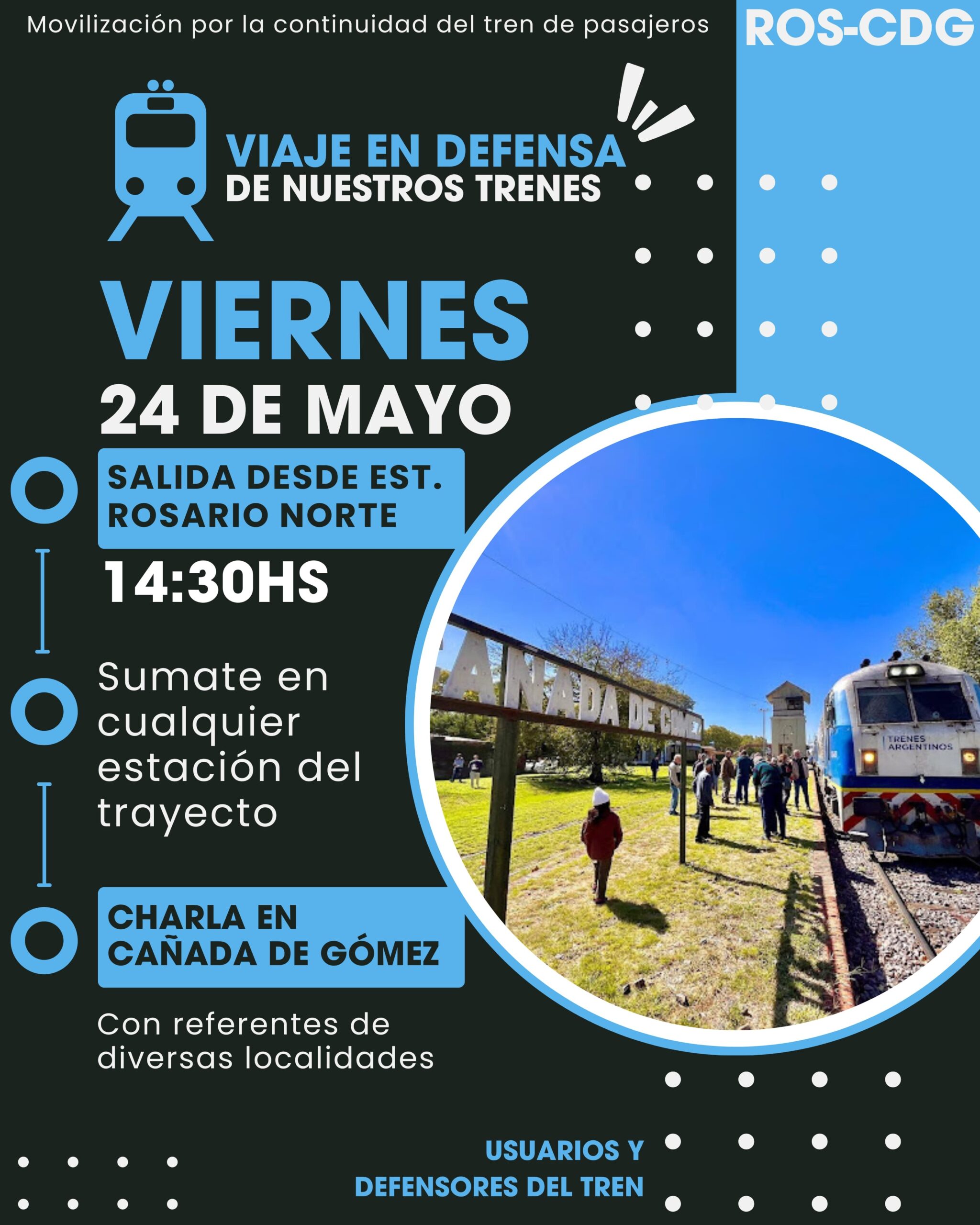 Viaje en defensa de nuestros trenes. Viernes 24 de mayo. Salida desde la estación Rosario Norte a las 14.30. Sumate en cualquier estación del trayecto. Charla en Cañada de Gómez con referentes de diversas localidades