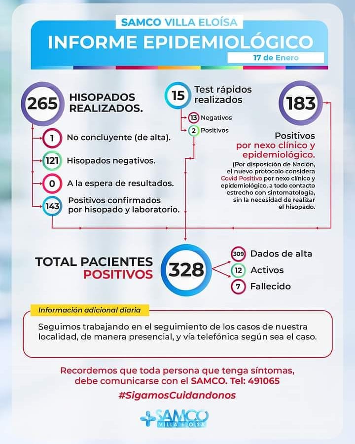 POR FAVOR, INSISTIMOS QUE TODA PERSONA QUE TENGA SÍNTOMAS O SOSPECHE TENERLOS, SE COMUNIQUE CON EL SAMCO POR MÁS MÍNIMA QUE SEA LA SOSPECHA, ES IMPORTANTE QUE LO HAGAN. El teléfono es 491065. ![]()