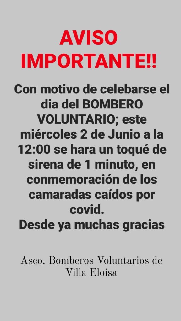 Nuevo RumboVilla Eloísa Villa Eloísa saluda a su prestigioso Cuerpo de Bomberos 2 junio, 2021 Raquel Vaschetto